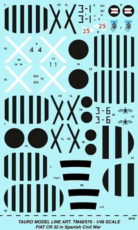 Hoja de calcas de Tauro Model a escala 1/48 para el Fiat CR.32 durante la Guerra Civil Española.