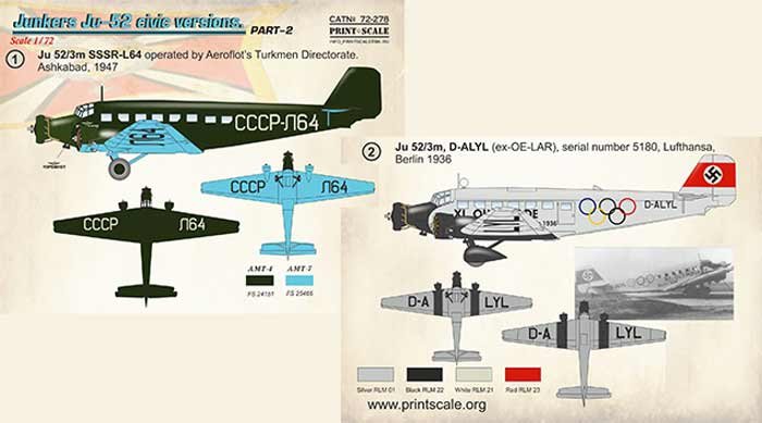 Calcas de la marca Print Scale a escala 1/72 para los Ju-52 civiles. Incluye calcas para 2 aparatos.