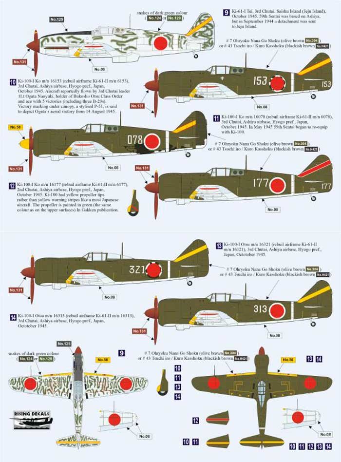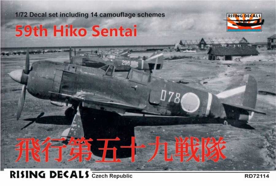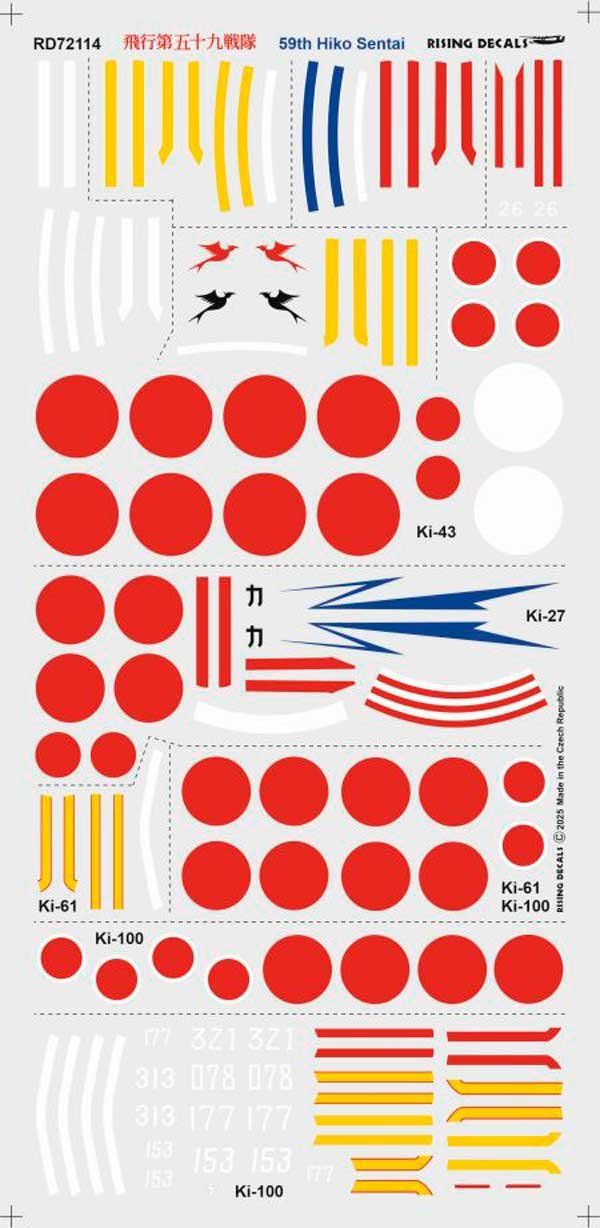 Set de calcas a escala 1/72 de Rising Decals del 59 Hiko Sentai, unidad de élite del IJA. Contiene calcas para 2 Ki-27, 6 Ki-43, 5 Ki-100 y 1 Ki-61.