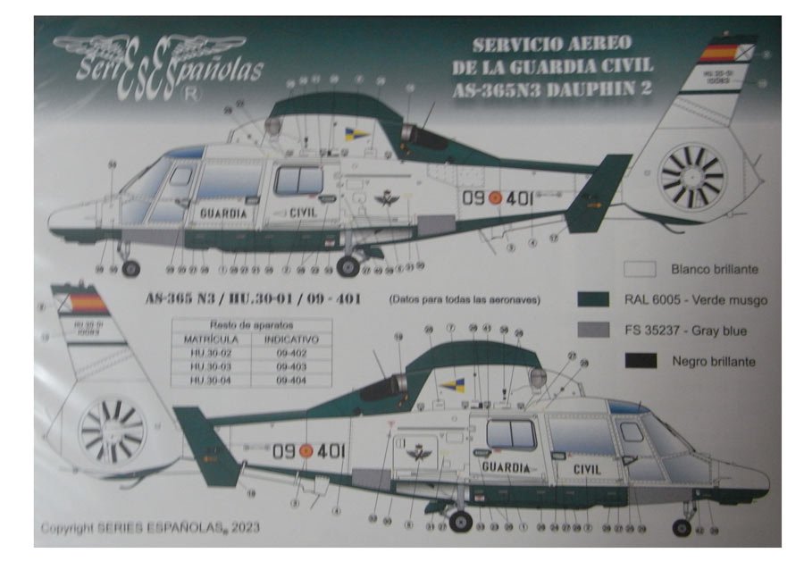 Set de calcas a escala 1/48 de Series Españolas para el AS-365 N3 Dauphin 2 de la Guardia Civil. Contiene calcas para 2 aparatos.