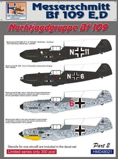 Calcas a escala 1/72 para Bf 109 D y E de caza nocturna de la marca H-Models Decals. Contiene calcas para 4 aparatos.