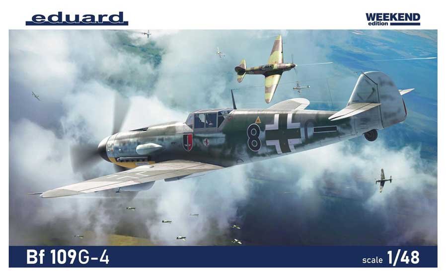 Maqueta a escala 1/48 del Bf 109 G-4 de Eduard. Edición Weekend. Contiene calcas para cuatro aparatos.