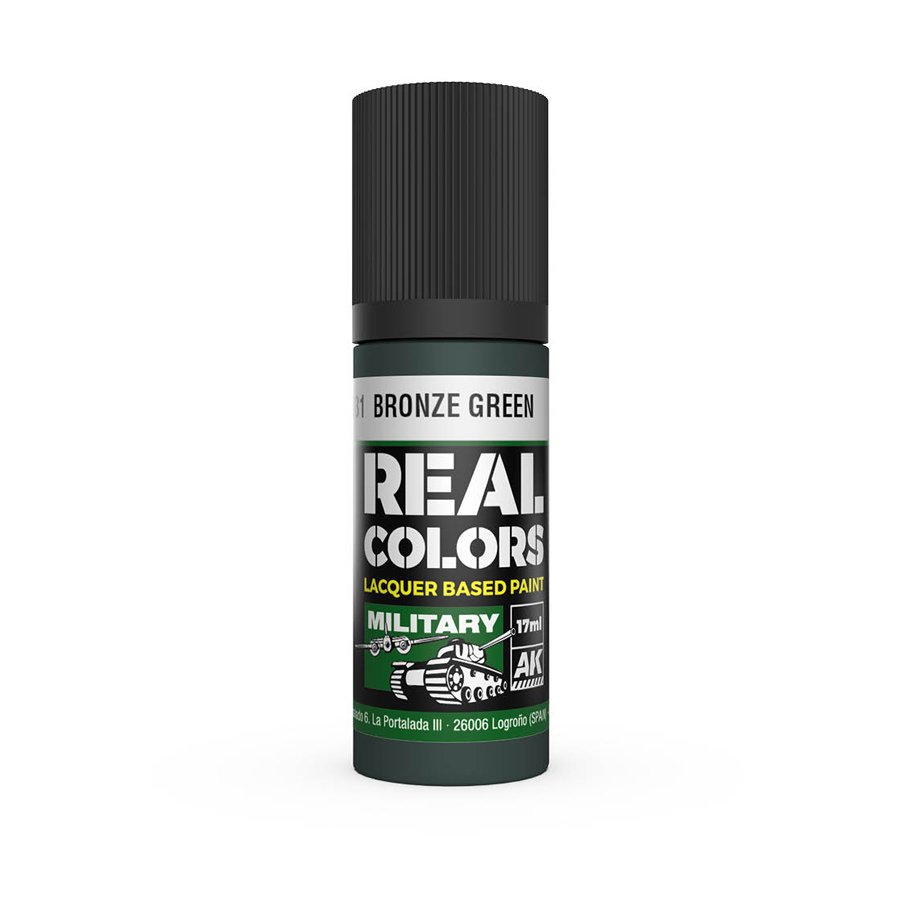 Pintura Bronze Green de la serie Real Colors de Ak Interactive. Pintura base laca. Indicada para el interior de aviones estadounidenses.
