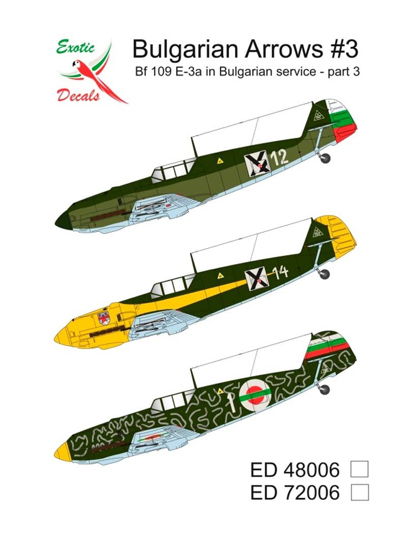 Calcas a escala 1/48 de Exotic Decals para Bf 109 E-3 búlgaros. La hoja contiene calcas para tres aparatos diferentes.