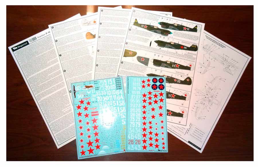 Calcas de Begemot a escala 1/48 para el P-40 ens ervicio en la VVS. Contiene calcas para 41 aparatos.