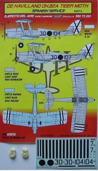 Calcas a escala 1/72 de Kora Decals para las Tiger Moth en servicio con el bando Nacional. Contiene calcas para dos aparatos y ruedas de resina.