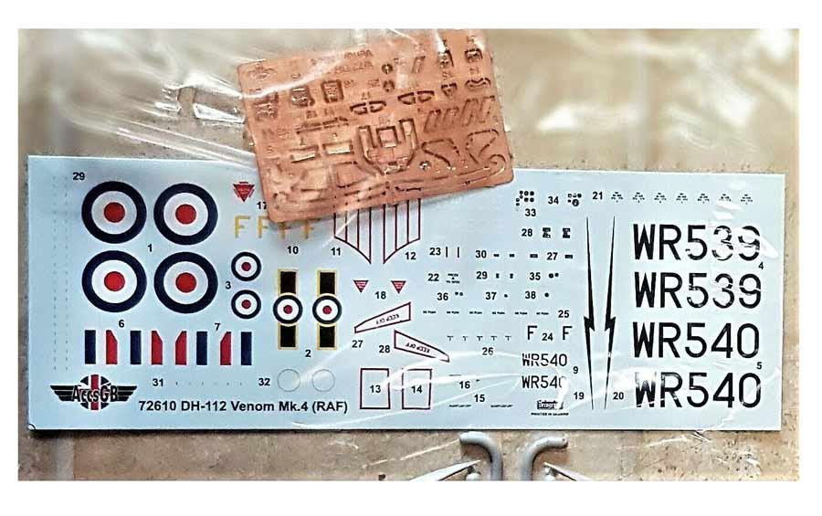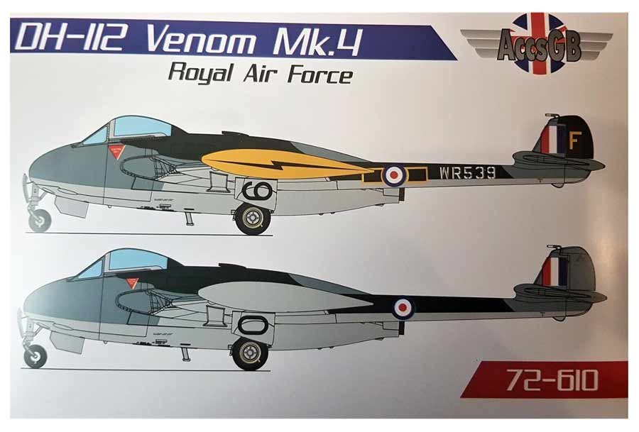 MAqueta a escala 1/72 de Acces GB del De Havilland Venom. Nuevo molde. Contiene calcas para 2 aparatos y fotograbados.