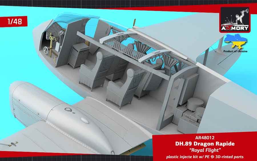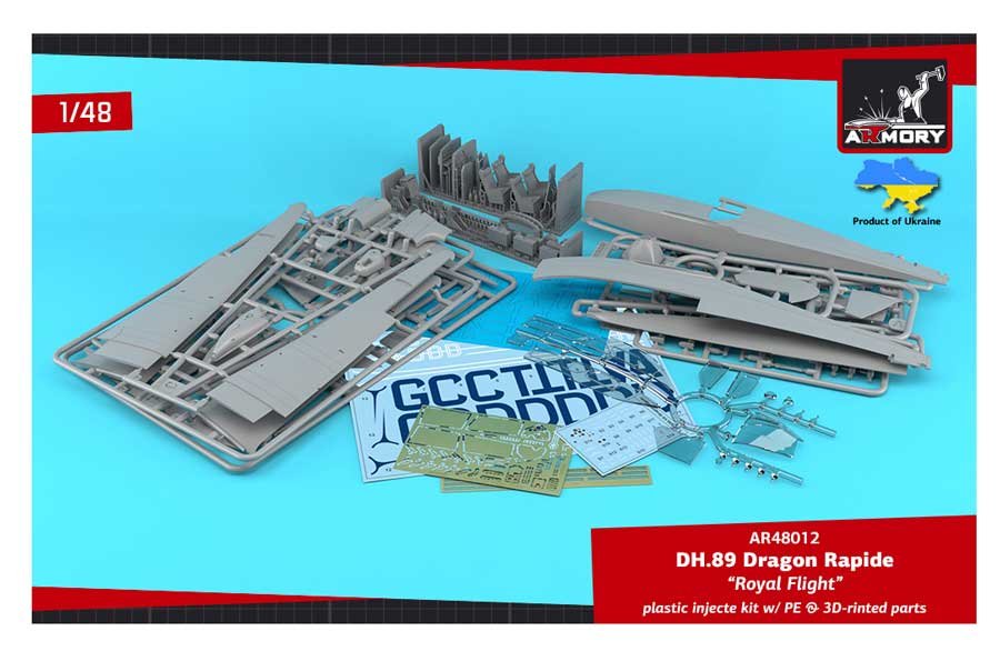 Maqueta a escala 1/48 de Armory del DH.89 Dragon Rapide de la Patrulla Real. Contiene calcas para un aparatos, fotograbados, mascarillas y un completo interior en resina 3-D.