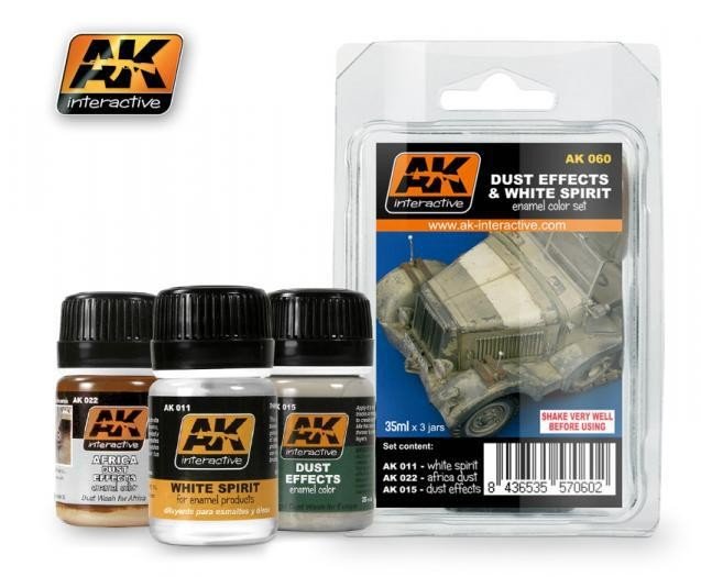 Set para crear efectos de polvo en cualquier vehículo en zonas áridas o secas, especialmente del Afrika Korps. Este set contiene tres colores en esmalte para pintar efectos en maquetas. AK Interactive ofrece los colores en sets que faciliten al modelista