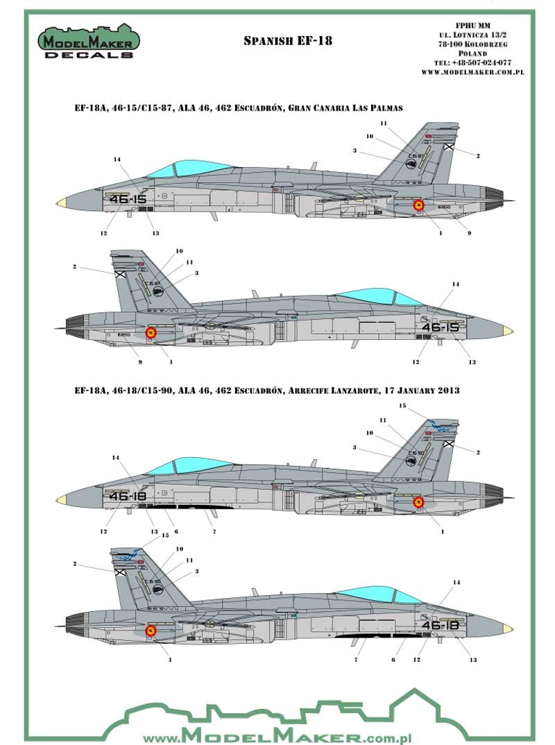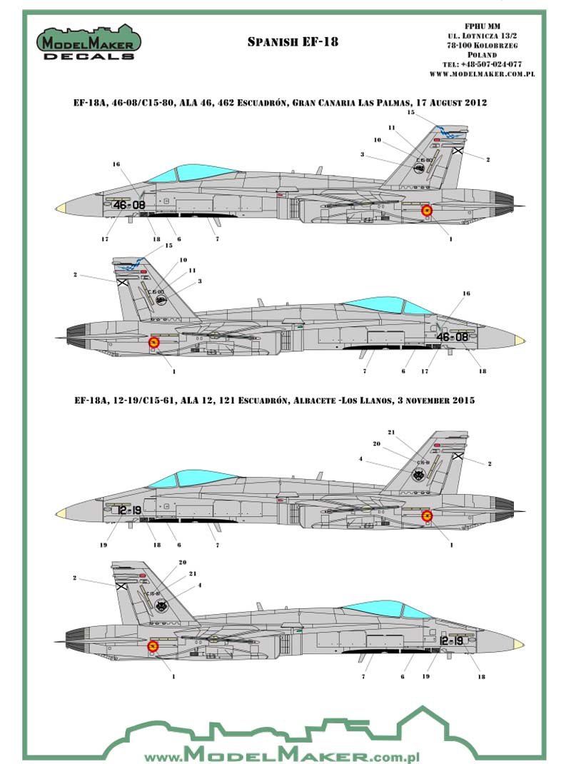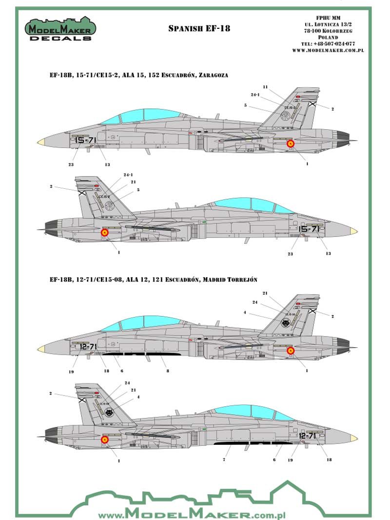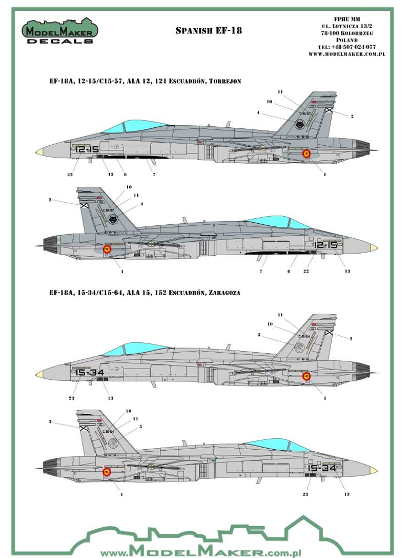 Set de calcas a escala 1/72 de Model maker Decals para los F/A-18 españoles. Contiene calcas para ocho aparatos.