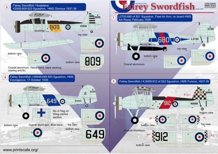 Calcas a escala 1/72 para el Fairey Swordfish de print Scale. Incluye calcas para 11 aparatos de distintas variantes.