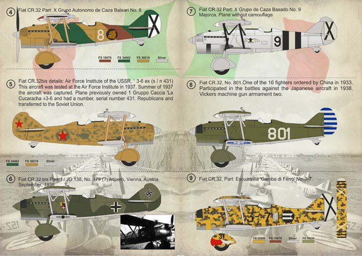 Contiene calcas para 9 aparatos, 4 de ellos en las filas Nacionales durante la Guerra CIvil Española.