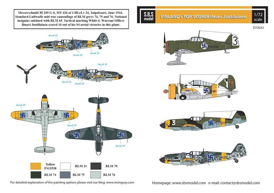 Hoja de calcas a escala 1/72 de SBS Model para los aviones del as finés Ilmari Juutilainen. Contiene calcas para 4 aparatos: Fokker D.XXI, brewster Buffalo y 2 Bf 109 G.