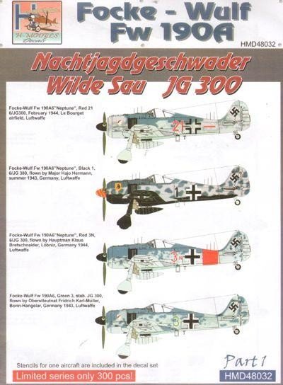 Calcas a escala 1/48 para los Fw 190 de caza nocturna de la firma H-Models Decals. Contiene calcas para 4 aparatos de la JG300.