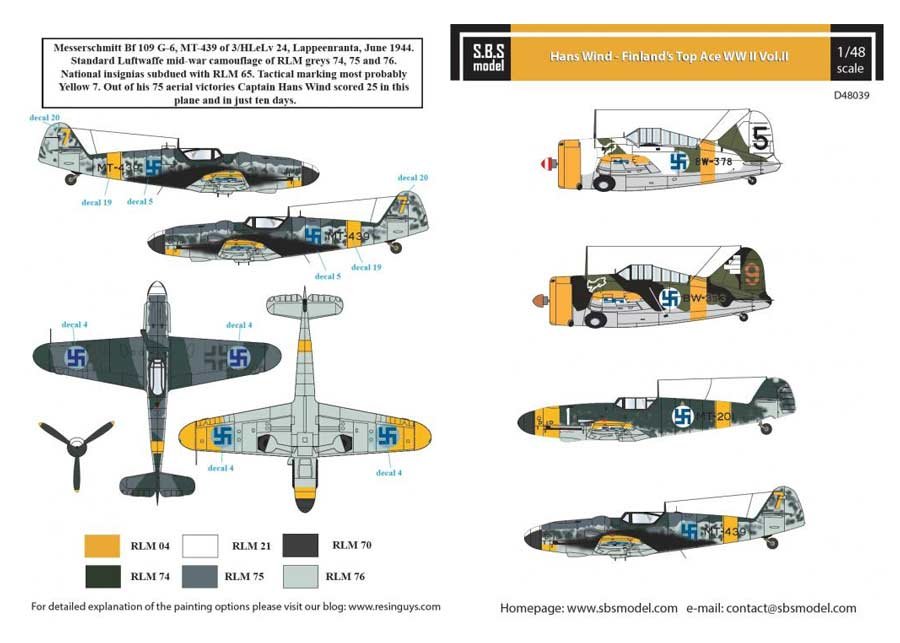Hoja de calcas a escala 1/48 de SBS Model para los aviones del as finés Hans Wind. Contiene calcas para cuatro aparatos: 2 brewster Buffalo y 2 Bf 109 G