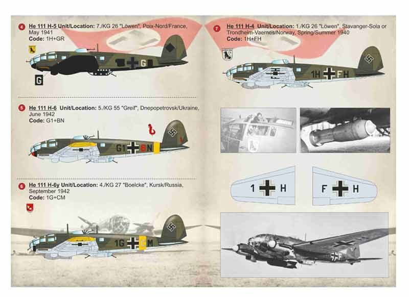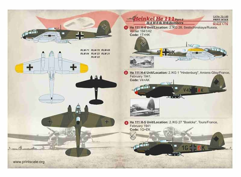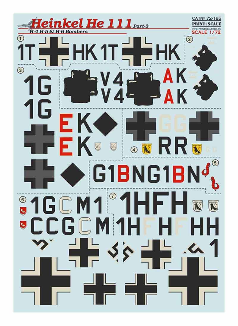 Set de calcas a escala 1/72 de Print Scale para el He-111 en diversas variantes. Contiene calcas para 7 aparatos.