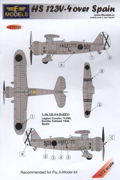 Calcas a escala 1/72 para el Henschel Hs 123 V4 de la Guerra Civil Española, de la firma LF Models. Incluye calcas para un aparato.