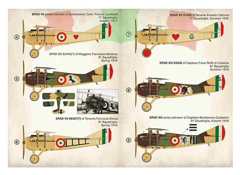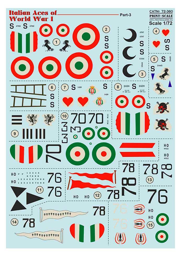 CAlcas a escala 1/72 de Print Scale para ases italianos de la Primera Guerra Mundial. Contiene calcas para 15 aparatos.