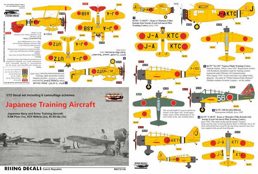 Set de calcas a escala 1/72 de Rising Decals sobre aviones de entrenamiento japoneses. Incluye calcas para 6 aparatos.