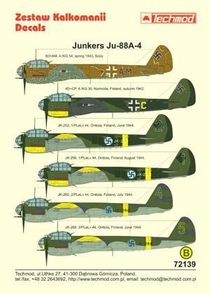Calcas para el Junkers Ju-88 A-4. Incluye: Ju 88A-4, B3+AM, 4./KG 54, Sicily, Spring 1943 Ju 88A-4, 4D+CP, 6./KG 30, Nurmoila, Autumn 1942 Ju 88A-4, JK-252, 1/PLeLv 44, Onttola, Finland, June 1944 Ju 88A-4, JK-256, 1/PLeLv 44, Onttola, Finland