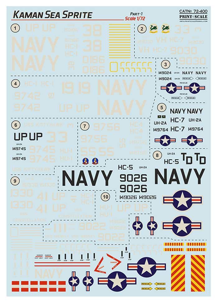 Calcas a escala 1/72 de Print Scale para el Kaman Sea Sprite. Contiene calcas para 10 aparatos.