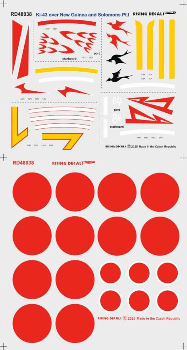 Set de calcas a escala 1/48 de Rising Decals para los Ki-43 sobre Nueva Guinea y las Salomón. Contiene calcas para cinco aparatos.