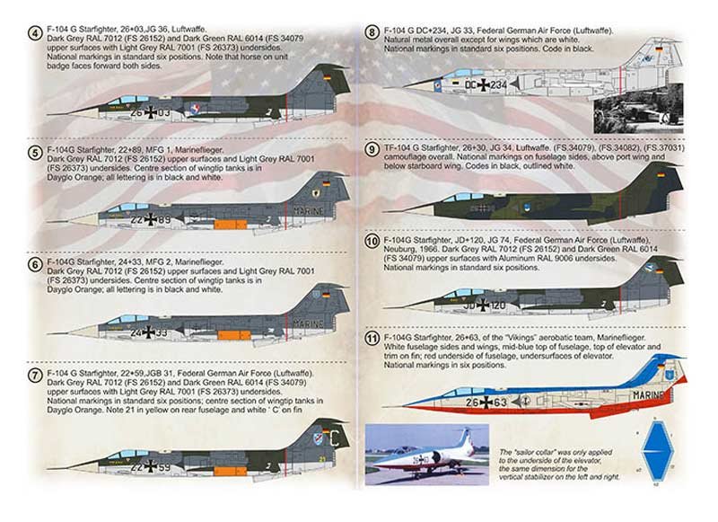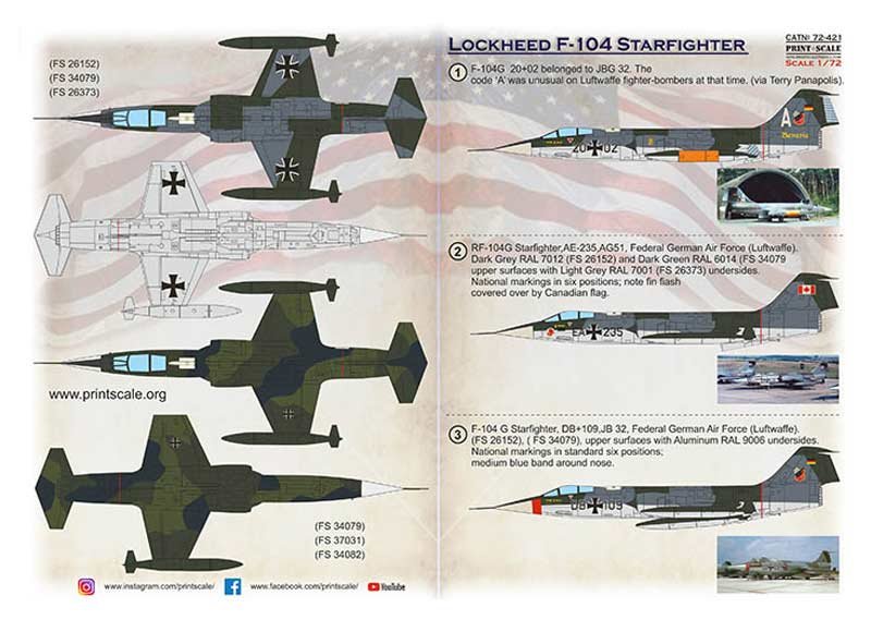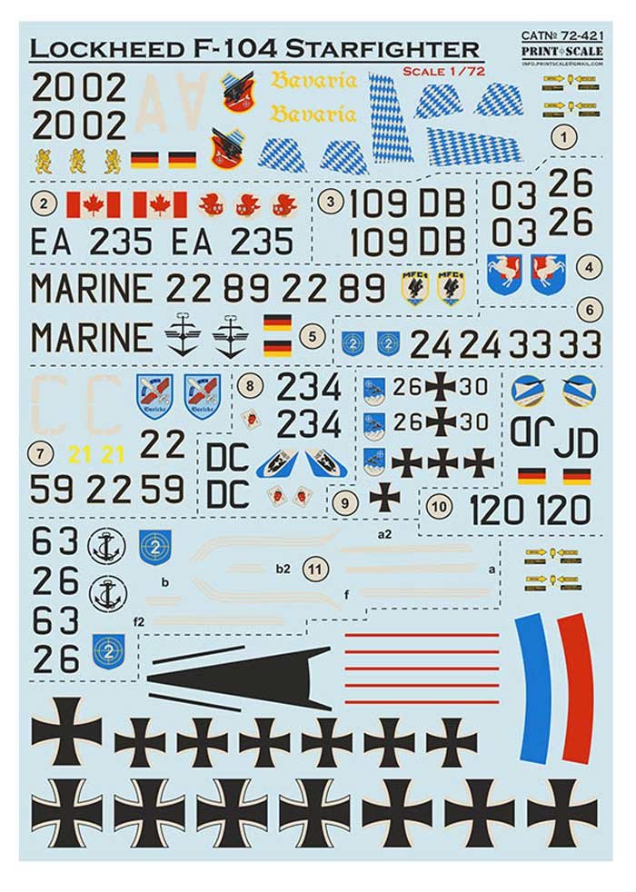 Calcas a escala 1/72 de Print Scale para el F-104 Starfighter. Contiene calcas para 11 aparatos.