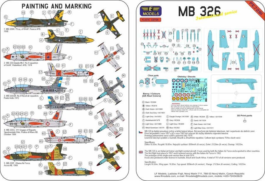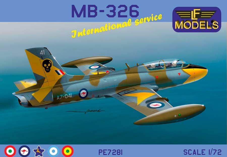 Maqueta a escala 1/72 de LF Models del Aermacchi MB-326. Nuevo molde. Edición de aparatos de exportación. Incluye calcas para cinco aparatos.