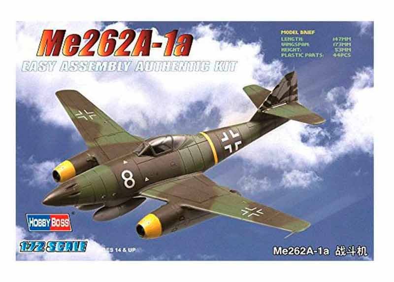 Maqueta a escala 1/72 de Hobbyboss del Me 262 A-1a. Contiene calcas para 2 aparatos. Maqueta fácil de montar. ideal para principiantes.