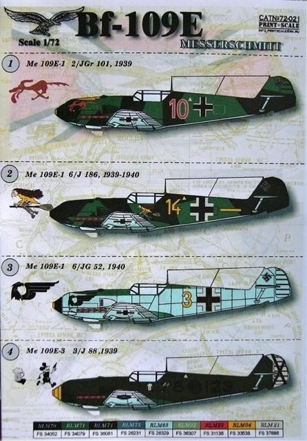 Calcas a escala 1/72 de Print Scale para el Bf 109 E. Contiene calcas para 16 aparatos diferentes, uno de ellos de la Legión Cóndor.