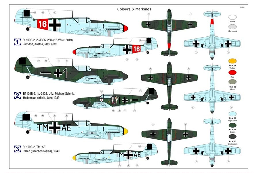 Maqueta a escala 1/72 del Bf 109 B de AZ Model. Nuevo molde. Contiene calcas para tres aparatos. y mascarillas.