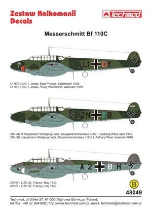 Calcas para el Messerschmitt Bf110C. Incluye: Bf 110C, L1+DY, I./LG 1, Luftwaffe, Jesau, East Prussia, September 1939 Bf 110C, A2+BH, I./ZG 52, France, May 1940 Bf 110C, 2N+GB, I./ZG 1, Hauptmann Wolfgang Falck, Luftwaffe, Aalborg-West, Denmark,