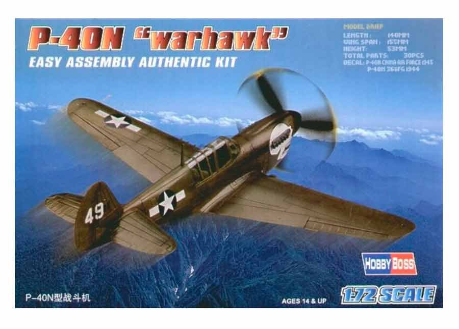Maqueta a escala 1/72 de Hobbyboss del P-40 N Warhawk. Contiene calcas para 2 aparatos. Maqueta fácild e montar. Ideal para principiantes.