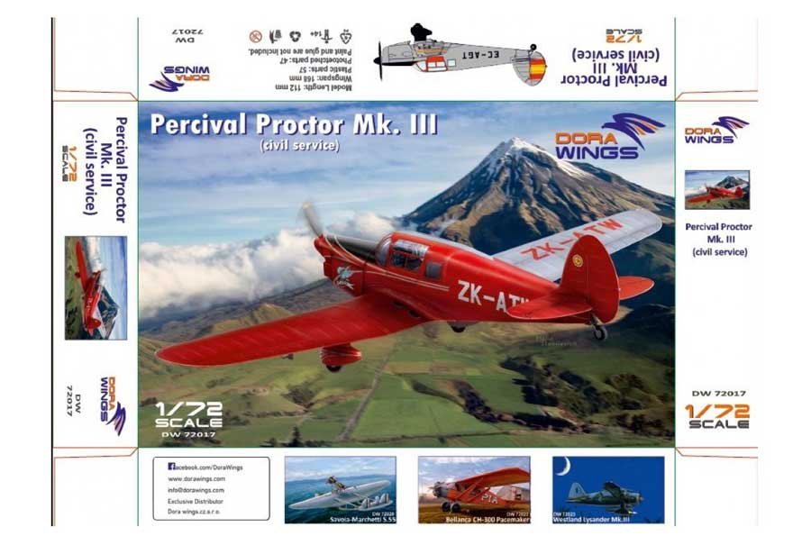 Maqueta a escala 1/72 de Dora Wings del PErcival proctor Mk.III. Contiene fotograbados, mascarillas y calcas para 4 aparatos, uno de ellos español de un aeroclub de los años 50.