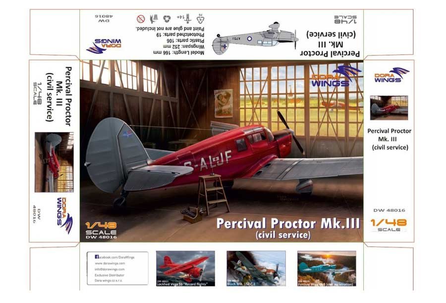 Maqueta a escala 1/48 de Dora Wings del PErcival proctor Mk.III. Contiene fotograbados, mascarillas y calcas para 4 aparatos, uno de ellos español de un aeroclub de los años 50.