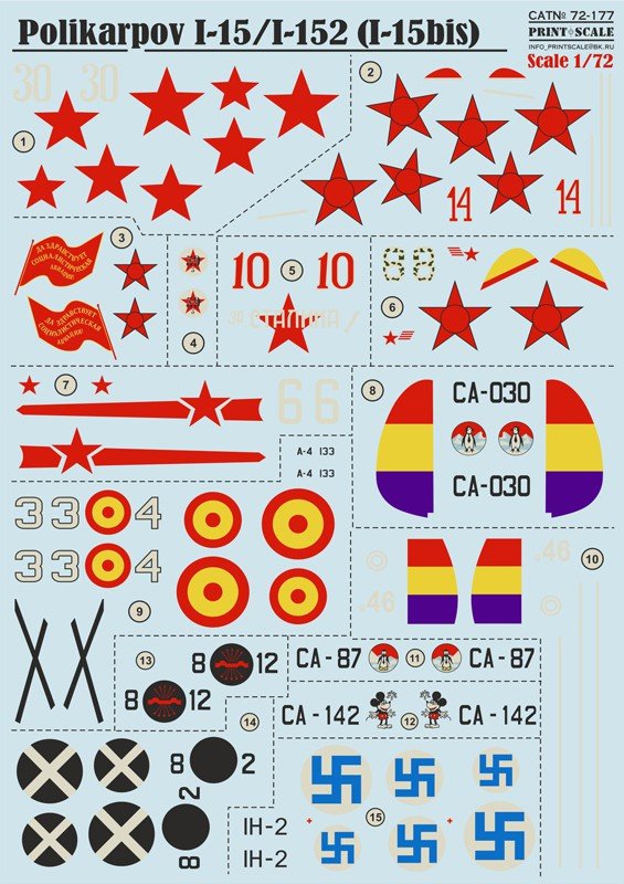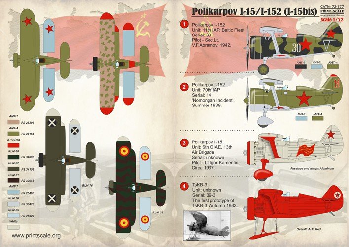 Calcas a escala 1/72 para el Polikarpov I-15 de la marca Print Scale.