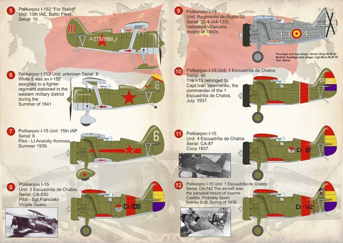 Contiene calcas para 15 aparatos, 4 Republicanos y 3 en las filas Nacionales durante la Guerra Civil Española.
