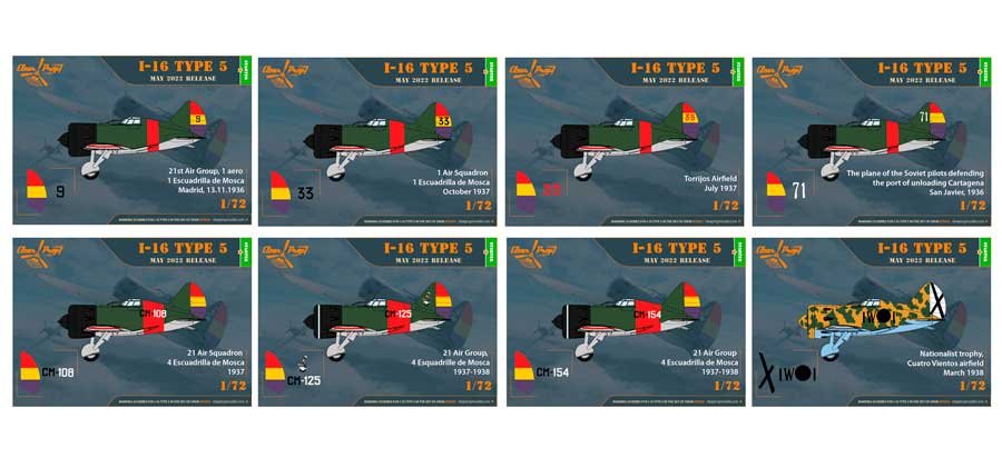 Maqueta a escala 1/72 de Clear Prop del I-16 Tipo 5. Nuevo molde. Contiene calcas para 8 aparatos de la Guerra Civil.