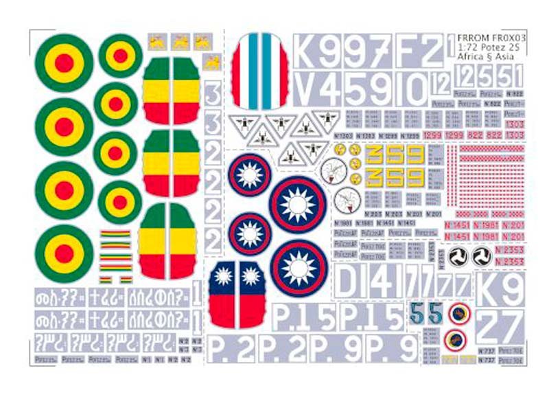 Set de calcas a escala 1/72 de FRROM para el Potez 25. Contiene calcas para 7 aparatos, uno de ellos español.
