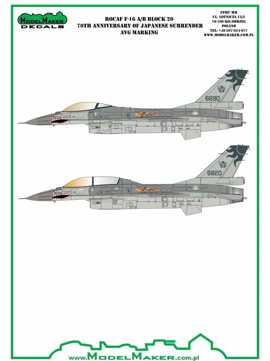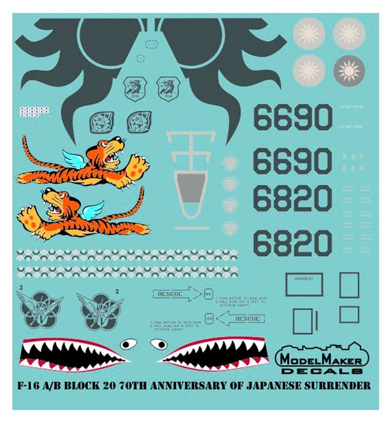Set de calcas de Model Maker Decals a escala 1/48 para los F-16 A/B Block 20 de la ROCAF en aniversario de los 70 años de la rendiciónd e Japón y en honor de los Tigres Voladores.