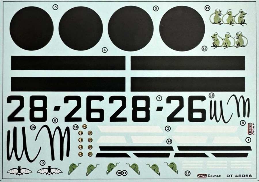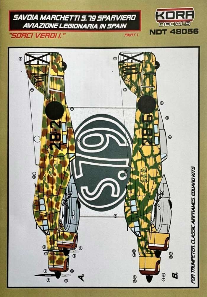 Set de calcas a escala 1/48 de Kora Models para los Sm 79 Sparviero de la Aviazione Legionaria durante la Guerra Civil Española. Contiene calcas para dos aparatos de lso Sorci Verdi.