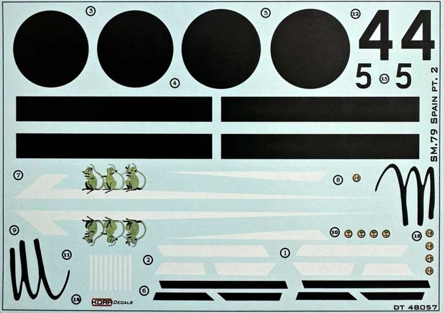 Set de calcas a escala 1/48 de Kora Models para los Sm 79 Sparviero de la Aviazione Legionaria durante la Guerra Civil Española. Contiene calcas para dos aparatos del Angelito con bomba.