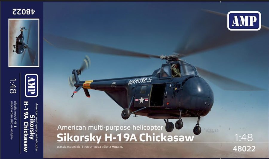 Maqueta a escala 1/48 de AMP del Sikorsky H-19 A Chicksaw, el famoso Pepo de la MArina española. Nuevo molde. Contiene fotograbados, mascarillas y resinas en 3D para detallar la maqueta. Contiene calcas para 4 aparatos.