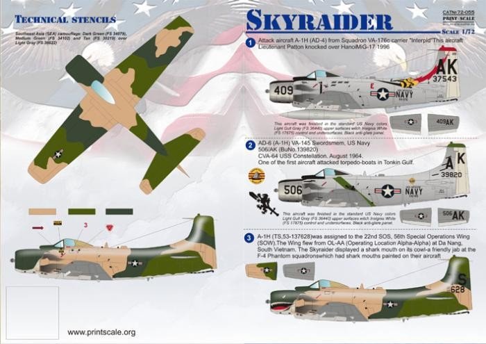 Calcas a escala 1/72 para el Skyraider de la firma Print Scale. Incluye calcas para 6 aparatos.