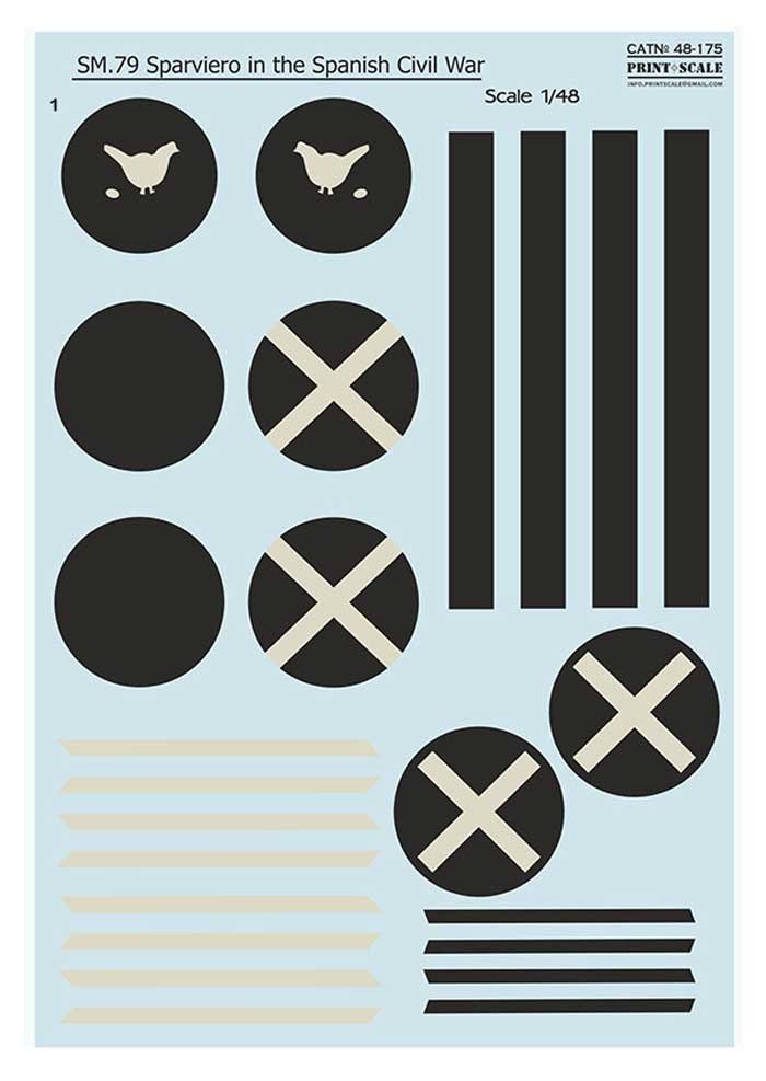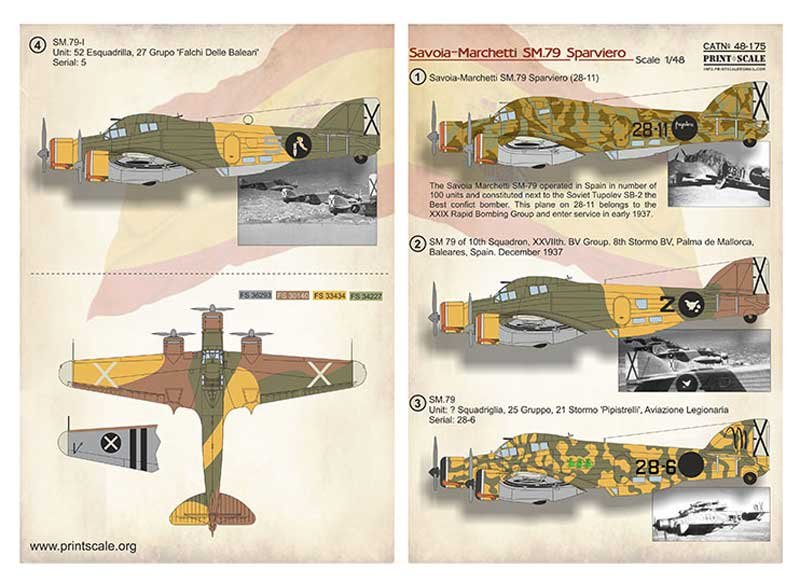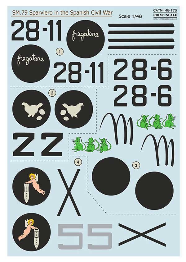 Set de calcas a escala 1/48 de print Scale para el SM-79 Sparviero. Contiene calcas para 4 aparatos.