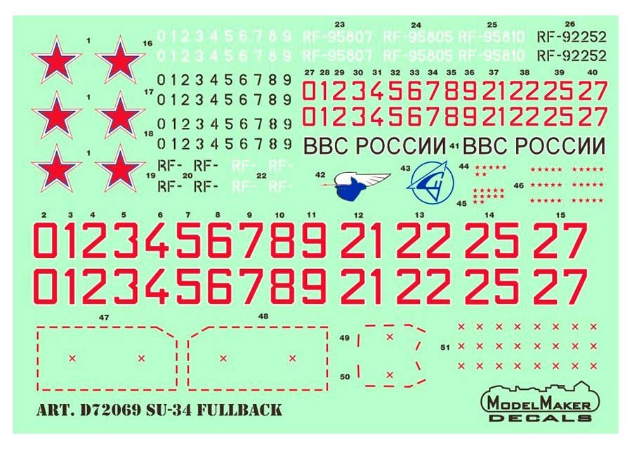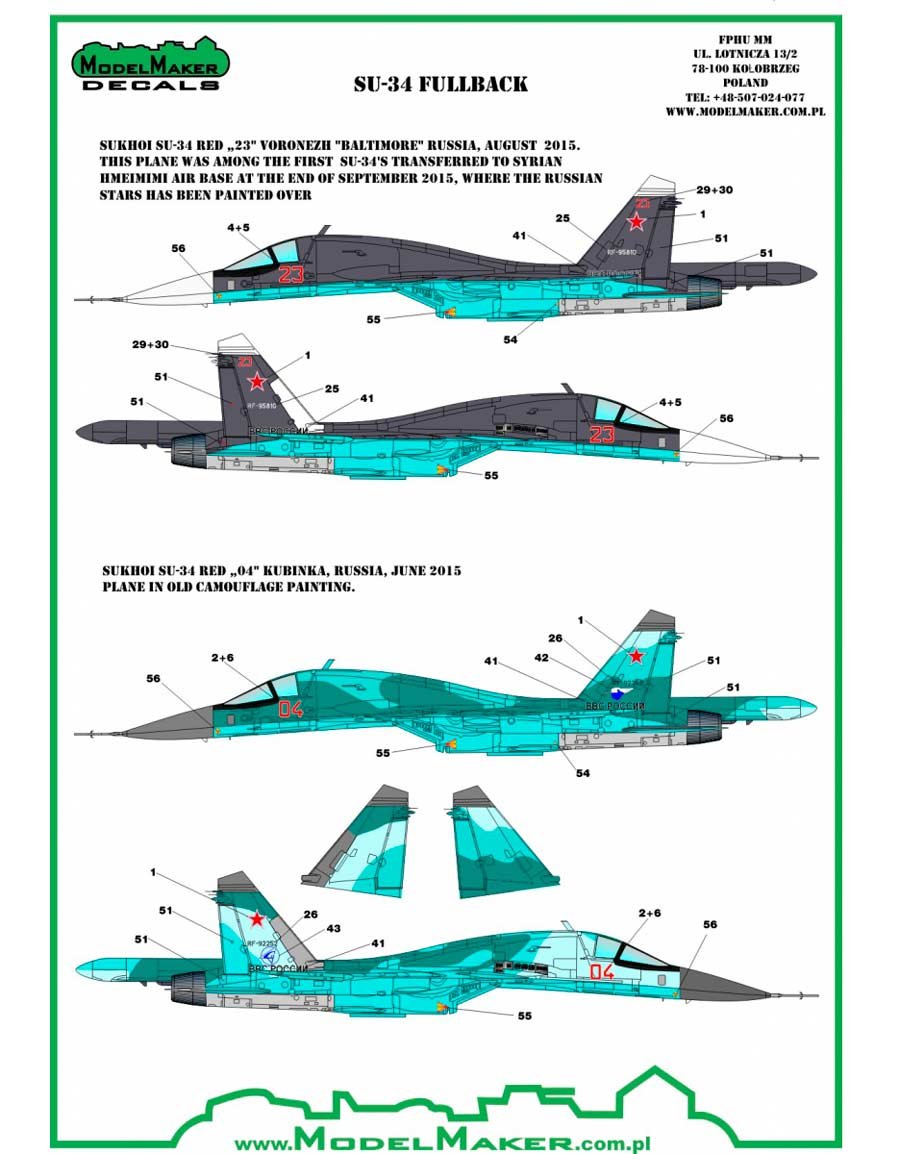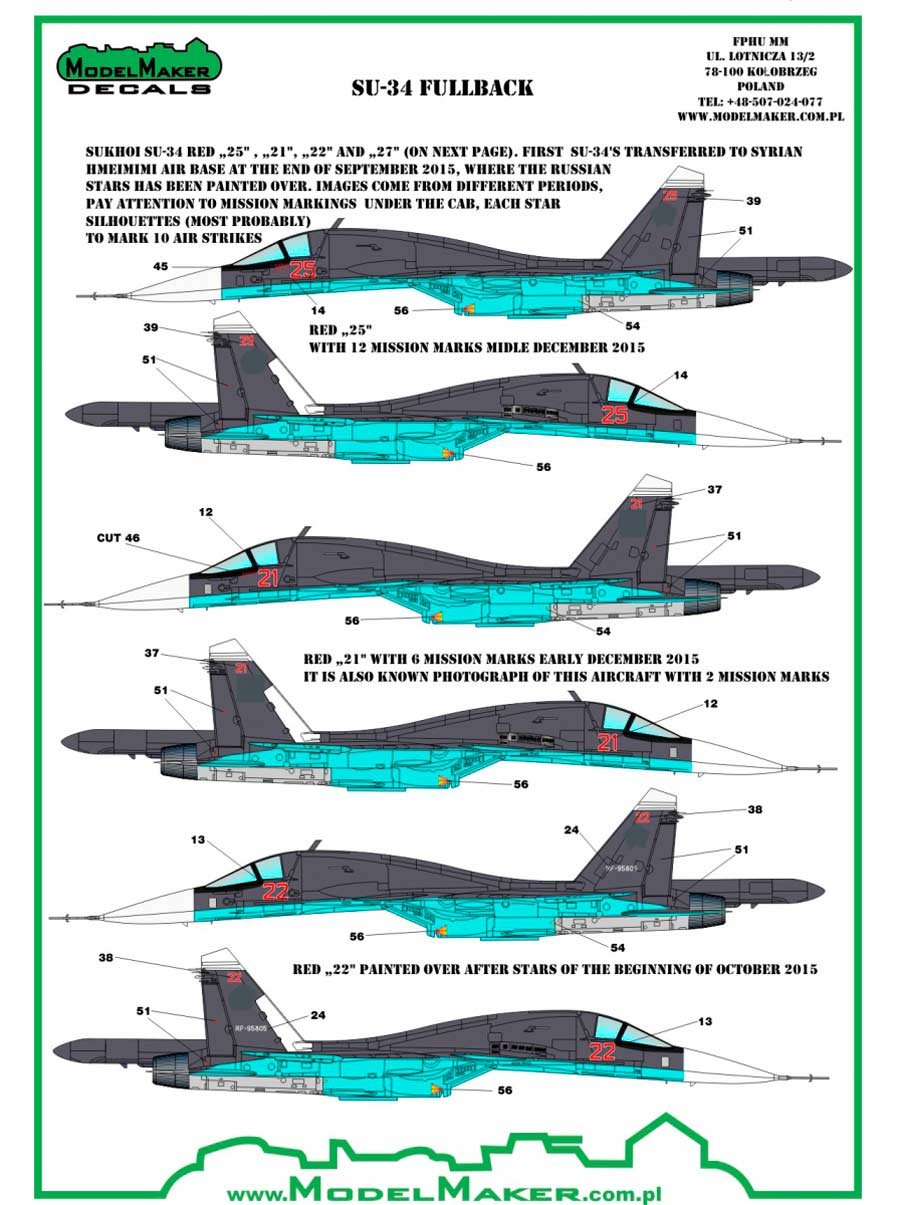 Set de calcas a escala 1/72 de Model Maker Decals para los Sukhoi Su-34 Fullback en servicio en Siria. Contiene calcas para siete aparatos.