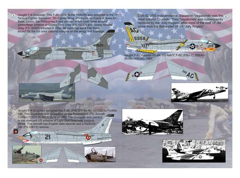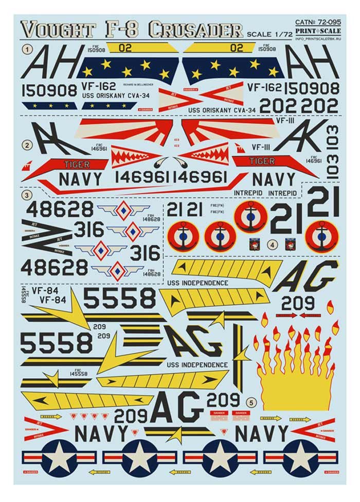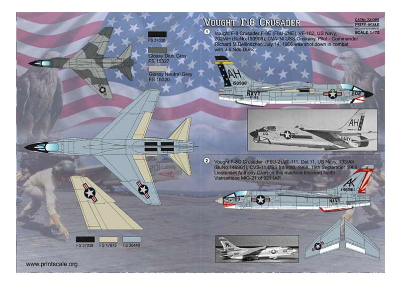 Calcas a escala 1/72 de Print Scale para el F-8 Crusader. Contiene calcas para 4 aparatos.